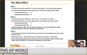 Halo effect basically means that if a company’s stock price is going up, everybody believes that it has good management & vice-versa. He added, show me a company that delivers high performance and I can always find something positive to say about the person in charge. But this is necessarily not true (in the longer term). For example: Fortune Magazine in May 2000 claimed CISCO (share price then: USD 80) to be an outstanding company; the same magazine, a year later wrote that sales techniques of CISCO (share price in May 2001: USD 15) had been irksome.