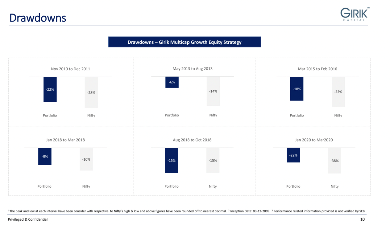 Times of crisis yet again prove a firm’s belief and the trust it has developed with its clients. There have been 6 major downturns post Girik Capital’s inception and it has always fallen less than the market index.