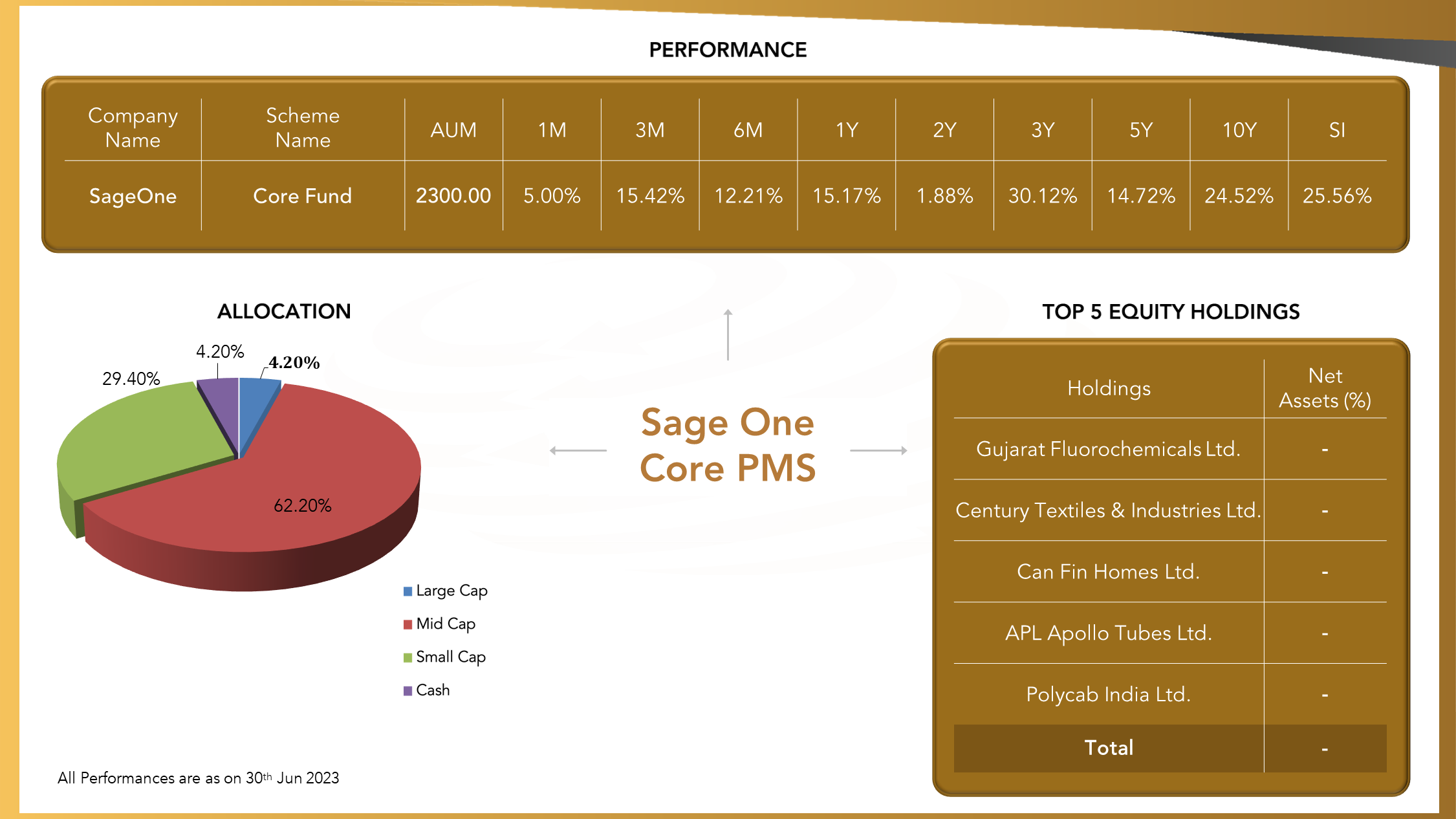 SageOne is a SEBI-registered Portfolio Management Services (PMS) and Alternative Investment Fund (AIF) provider, managing ₹5700+ Cr across high-conviction equity strategies since 2012. Founded by Samit Vartak, CFA, they specialise in bottom-up stock picking across mid-cap, small-cap, and large-cap companies, delivering consistent alpha and superior long-term CAGR.