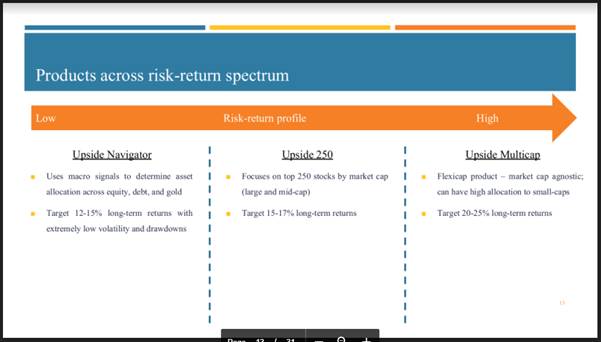 Upside AI positions their products considering the risk-return spectrum by using macro signals, a focussed approach, and a long-term investment horizon. It dynamically allocates money into equity, debt, and gold such that it is more systemized and manual work is minimal. Past performance – from June 07 to Nov ’21, the fund has generated 13.9% return which is a relative alpha of 2.1% as compared to Nifty 50 TRI of 11.8% and 3% as compared to Nifty Hybrid TRI of 10.9% CAGR. Upside AI’s PMS gives you equity-like returns with debt-like stability, by focussing on the top 250 stocks and it generally has a high allocation to small and mid-caps for long-term returns.